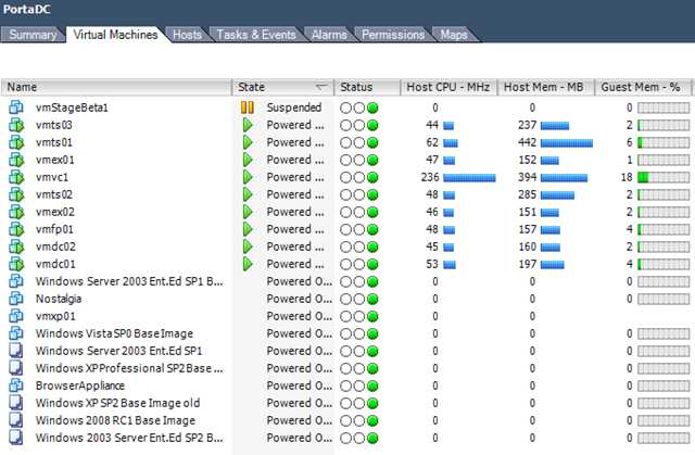 View of currently running VMs – a mix of Windows 2003/2008 VMs