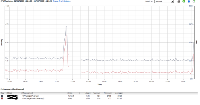 I thought I’d post some performance graphs from my cheap HP D530 ESX server using the Virtual Centre console (which incidentally, is good for getting this info quickly and simply).