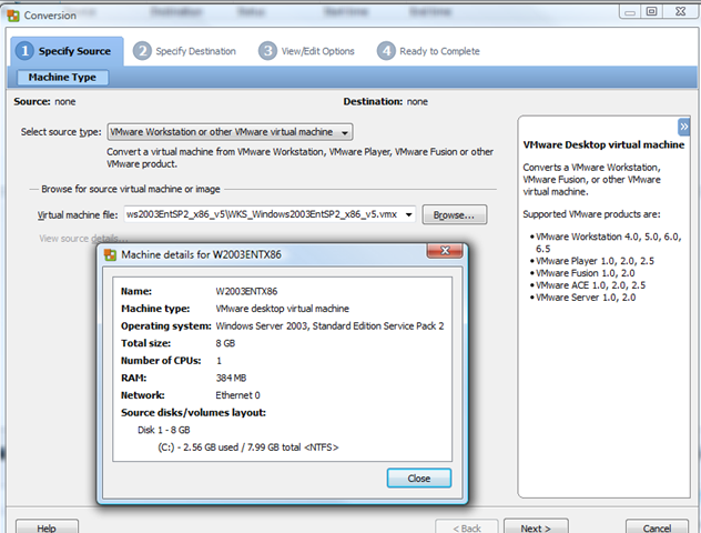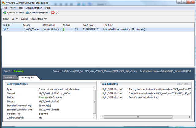 1st task is to import the Windows Server 2003 image from Workstation to ESX/VC using VM Converter 4.0;