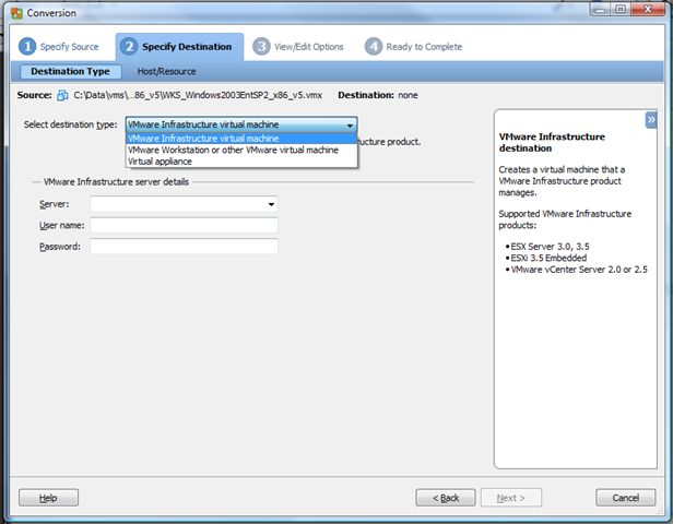 Select appropriate target – in this instance it was an ESX farm, controlled by Virtual Center so I chose VMware Infrastructure Virtual Machine and put the hostname and credentials for my Virtual Center host, you can of course go direct to each ESX host if you don’t have VC.