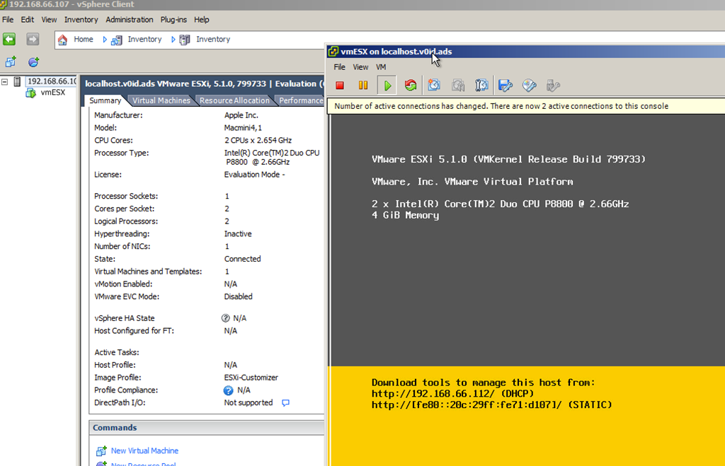 I alluded to this in this previous post, but due to a bug the Mac Mini locked up on boot with ESX5 and there were no network drivers, with vSphere 5.1 and a little bit of frigging it finally works – it lives!