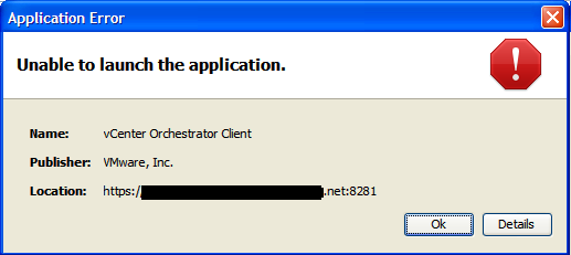 You’ll need to add your vCAC appliance URL to the exception list, note you need to specify the port number, or it won’t work. you can set this ON YOUR CLIENT WORKSTATION via Control Panel –> Java / Security on a Windows machine.