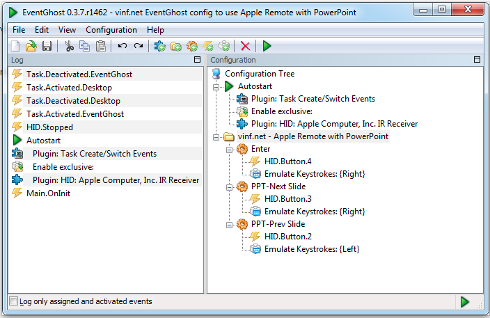 If you get an error about loading the HID plugin, then you may need to add it manually, right-click on HID: Apple Computers Inc IR Receiver and choose configure (you may have to remove/add it again as the file I exported may have device-specific IDs that don’t match yours exactly)