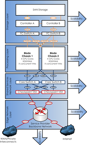 Solution: Cisco switching, trunked interconnects, 10Gb/bonded 1GbE, VLAN isolation, quick change enabled as beyond initial installation there are fewer requirements to send an engineer to plug something in or move it, Checkpoint VSX firewalls to allow delegated firewall configurations or to allow multiple autonomous business units (or customers) to operate from a shared, high bandwidth platform.
