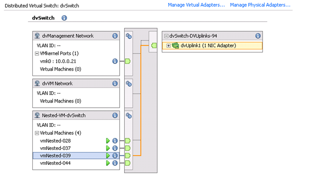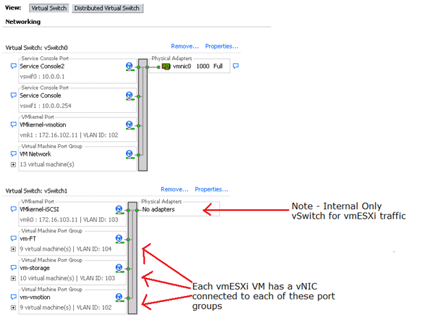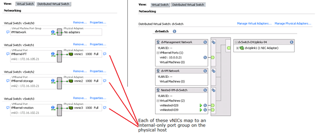 This diagram shows the virtual network configuration within each virtualized ESXi VM with vSwitch and dvSwitch config side-side.