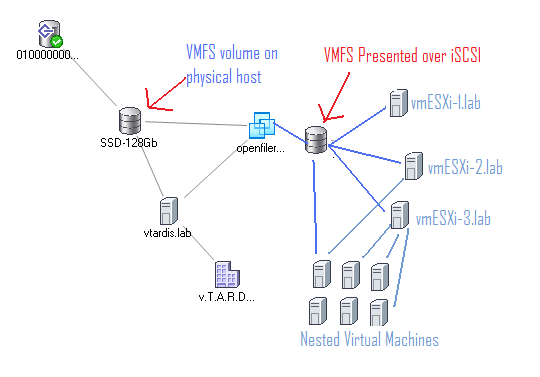 As a bit of a tangent I have been seeing how complex an environment I can get out of a single server (which I have dubbed v.T.A.R.D.I.S: Nano Edition) using virtualized ESXi hosts, the goals were;