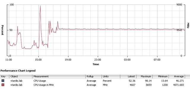 I left it to idle overnight and these are the performance charts for the physical host; the big spike @15:00 was the scripts running to deploy the 60 virtual machines