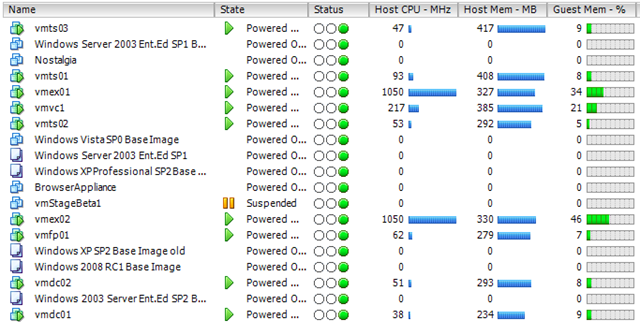 View of currently running VMs – a mix of Windows 2003/2008 VMs