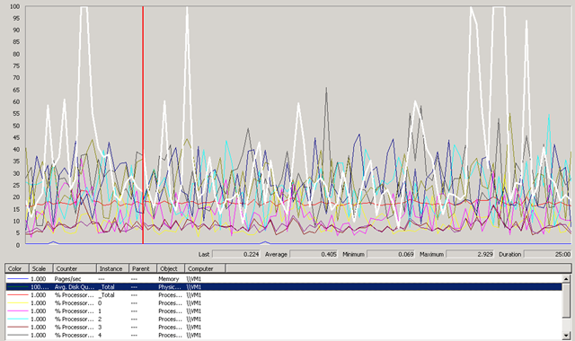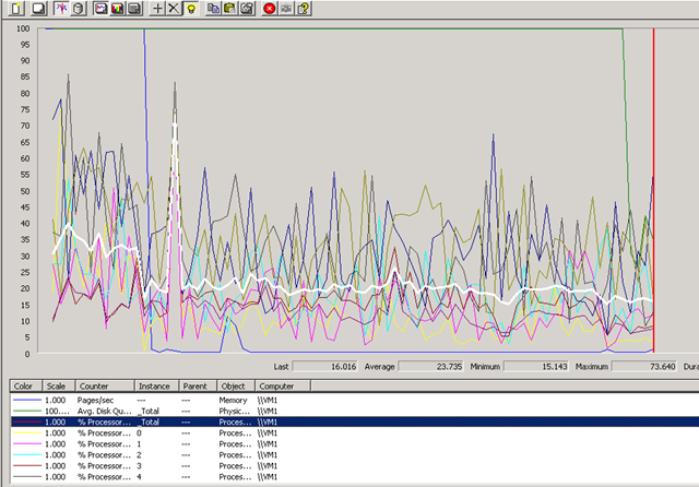 The blue line that makes a rapid drop is the pages/second counter, and the 2nd big drop (green) is the disk queue length. the hilighted (white) line is the overall %CPU time, note the sample frequency was 15 seconds on this perfmon.