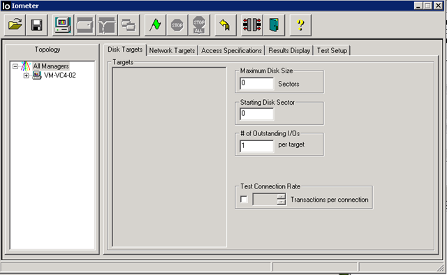 The use of the term manager is a bit confusing to me as you would think the “manager” is the machine running the IOmeter console, but actually each VM or physical server you want to load-test is a known as a manager, which in turn runs a number of workers which carry out the I/O tasks you specify and reports the results back to a central console (the IOmeter GUI application shown above).