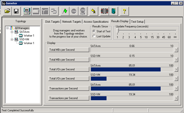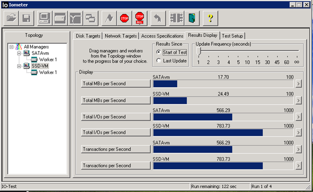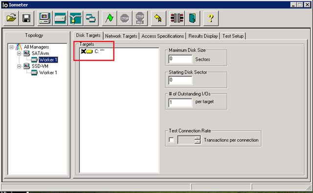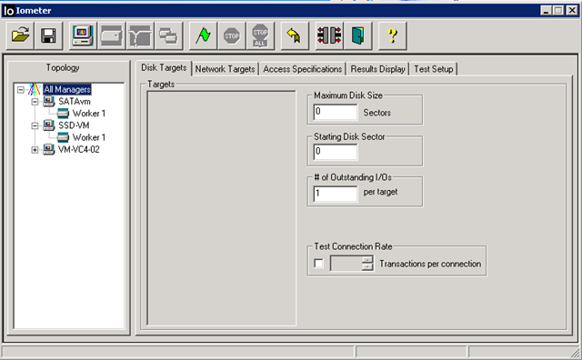 The IOmeter console will now show all the managers you have logged on – in my case I have one VM backed to a SATA disk and one VM backed to an SSD disk.