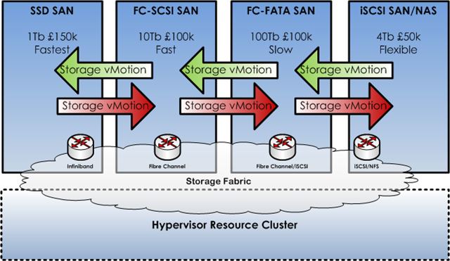 Using the infrastructure discussed above could add a second tier of load balancing without downtime to a DRS cluster. If a VM needs more disk throughput or is suffering from latency then you could move them to/from the more expensive solid-state storage tiers to FC-SCSI or even FATA disks, this ensures you are making the best use of fast, expensive storage vs. cheap, slow commodity storage.