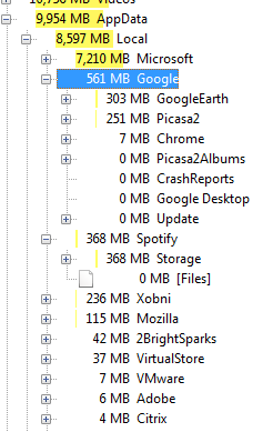 It seems lots of apps use this directory to store their data (as the name would suggest 🙂 but don’t clean up after you’ve uninstalled them – Xobni, I’m pointing the finger at you, Spotify and Google Earth also seem to keep data here, assume that’s a cache of downloaded content.