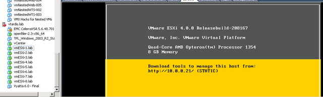 vTARDIS screenshot – each vmesxi-nn.lab node is really a virtual machine (see the manufacturer field below), but vCenter doesn’t care, and they are all running on a single $600 PC server with just 8Gb of physical RAM (over commit – yeah!)