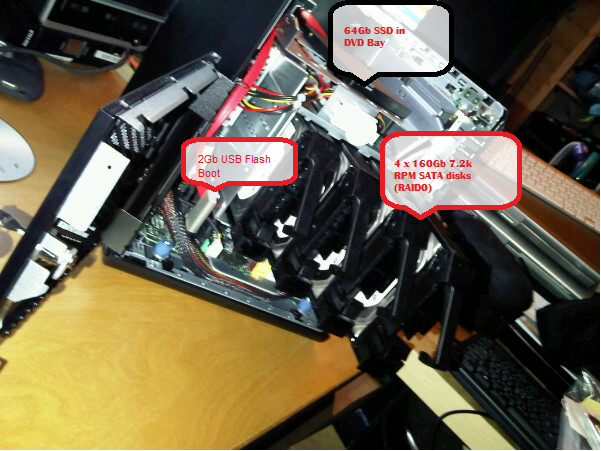 I am also booting the OS from a USB flash-drive – I had several 2Gb units but it wouldn’t install to them as they didn’t have quite enough space, so I’m using an 8Gb flash drive to hold the OS – this isn’t the most performant drive either so any swapping will be further impacted by the USB speed.