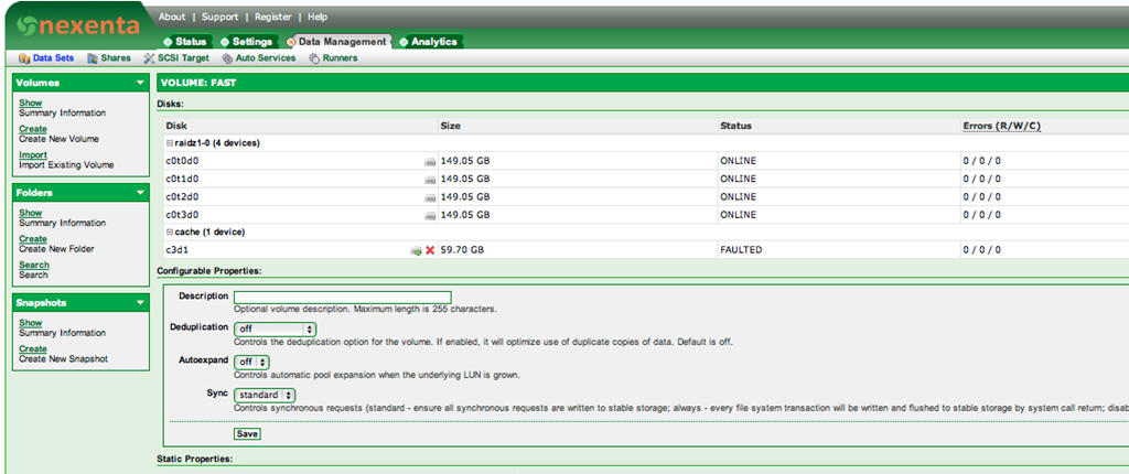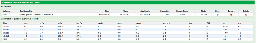 In my case the SSD c3d1 had no I/O at all – so if you click on the name of the volume shown in green (in my case it’s called “fast”) then you are shown the status of the physical disks.