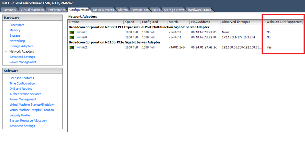 1st thing to note is that there is nowhere in vCenter to actually configure Wake-on-LAN, however you can check to see which NICs in your system support Wake On LAN (not all do, and not all have WoL-enabled vSphere drivers)