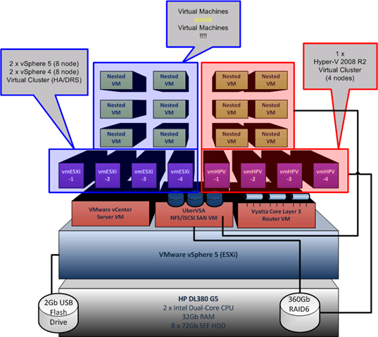 I have been working furiously on an updated version of the vTARDIS based around vSphere 5, and now it’s in the open (I was on the heavily NDA’d beta programme) the goal is the same: lowest cost possible physical hardware, but the ability to build complex production like ESX environments and run large amounts of virtual ESX hypervisors and guests.