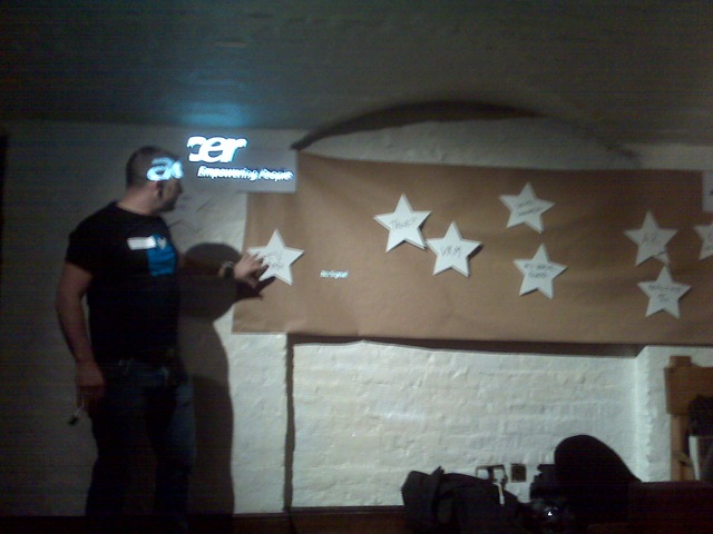 This evening’s topic was “2010 Trends – what’s hot and what’s not” and is set as a series of short 5 minute presentations by people in the creative industry – similar to the lightning talk format used at Cloudcamp. they made innovative use of a cool wall (Top Gear fans will know what I’m talking about :)) to rate the trends as hot or not through some alcohol fuelled volume based popularity measurement techniques (a.k.a shouting).